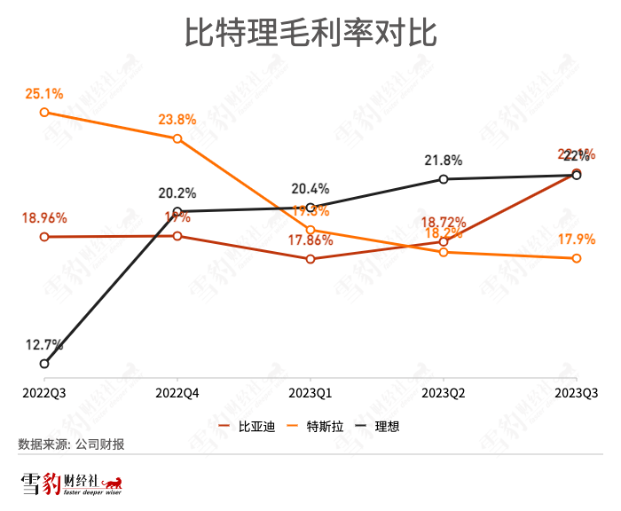 毛利率方面,理想2022年Q4之后甚至一度领先于比亚迪和特斯拉。2023年全年,理想毛利率为22.2%,比特斯拉高出4个百分点。