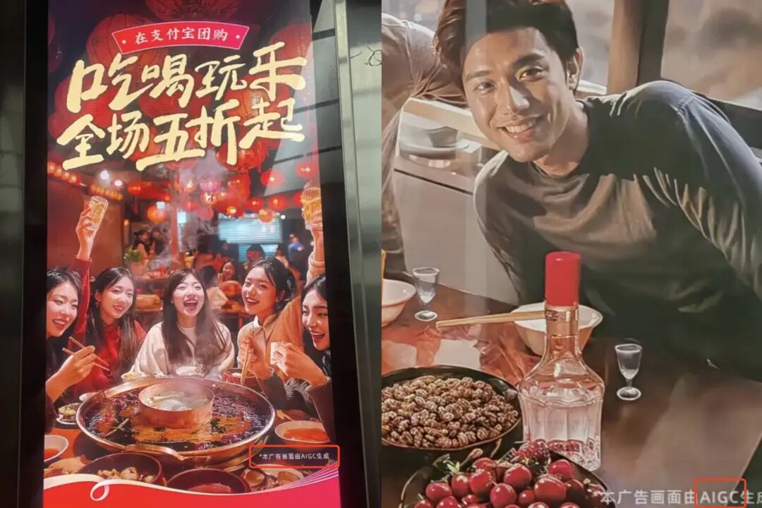 相比之下,支付宝的电梯广告相对正常,上来就打明牌标注了 AIGC,姐妹们围炉打火锅,或者兄弟几个喝喝小酒侃侃大山,除了食物卖相差点,人物油光和塑料感强了点,喜庆的氛围是有了。