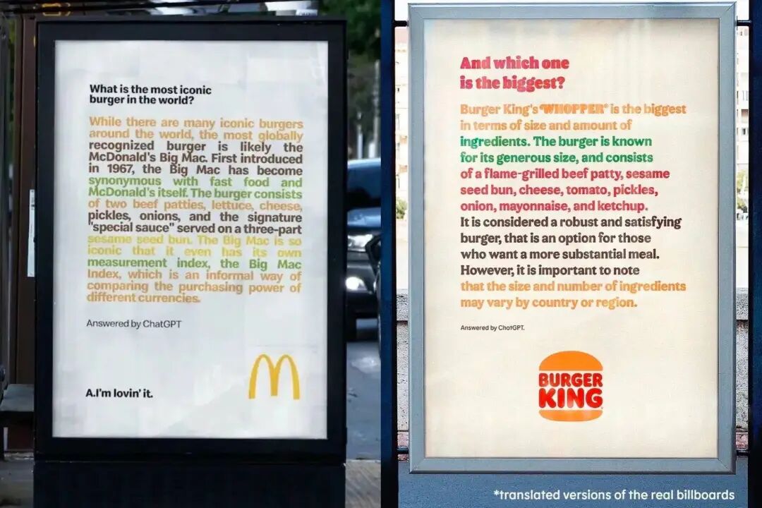麦当劳问「谁是世界上最具标志性的汉堡」,ChatGPT 说了「巨无霸」,当地的汉堡王不甘示弱,向 ChatGPT 提问「谁是世界上最大的汉堡」,答案「皇堡」正中下怀。两个品牌的完整回答,都被做成了车站海报并排摆放。