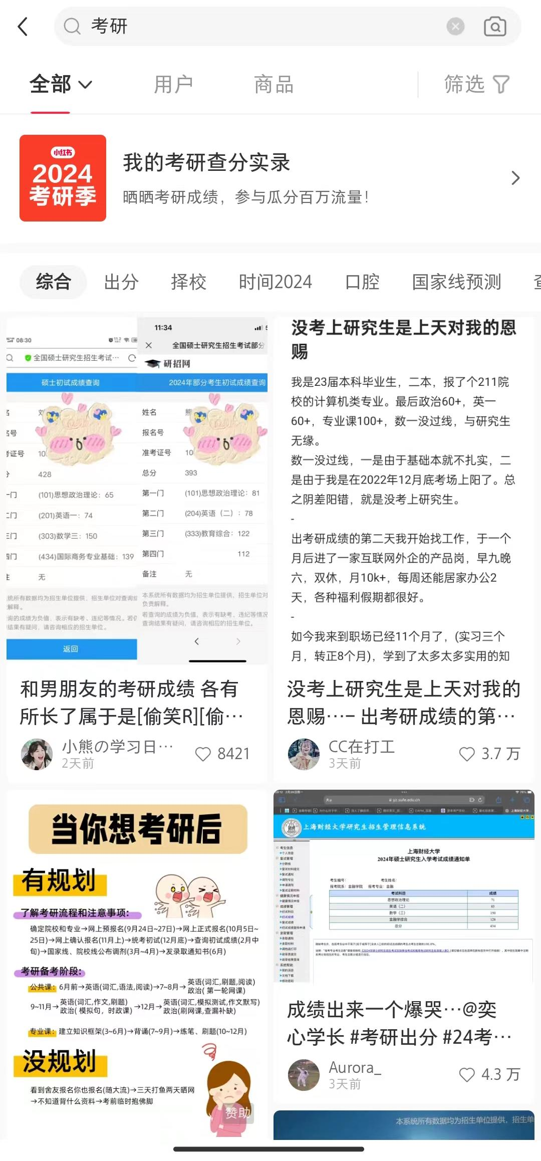 排在前列的几乎都是考研相关机构的广告,只有向下拉一段距离,才能在一系列广告之间找到夹在中间的一些“考研经验”、“考研常识”。
