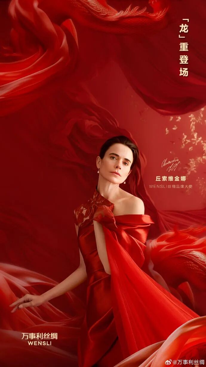花西子镜头下的丘妈是一整个怪异,万事利视野下的丘妈是优雅有贵气。