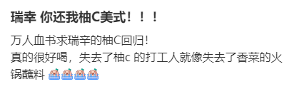 同系列柚C美式曾下架140天,期间网友们呼声不断,自发“请愿”要求柚C美式回归,本周回归后,网友们纷纷晒单,直呼“还是熟悉的味道”!种种迹象表明,C系列美式系列在年轻圈层中有着超高人气。瑞幸是怎么做到让年轻人心甘情愿吃“苦”的?