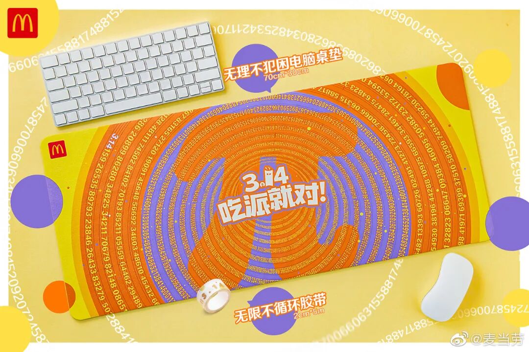 麦当劳借π这个全球老少熟知的数学概念,在3.14这天努力塑造麦当劳派的产品认知,试图让两个“派”的记忆度实现紧密捆绑。