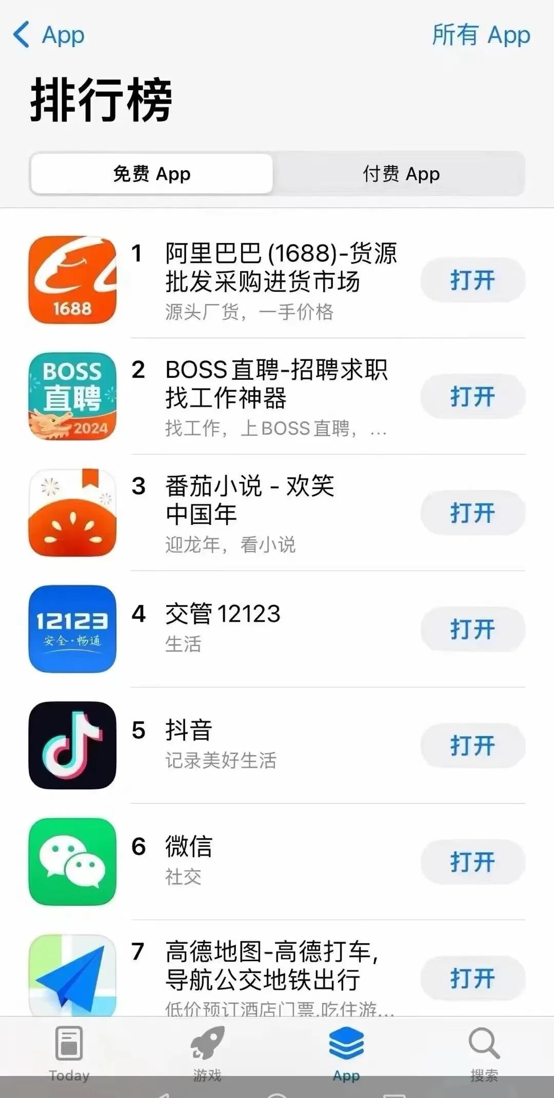 2月底,1688超过抖音和微信,登顶苹果应用商店免费下载榜,这已是1688最近一年内,第二次登上榜首。