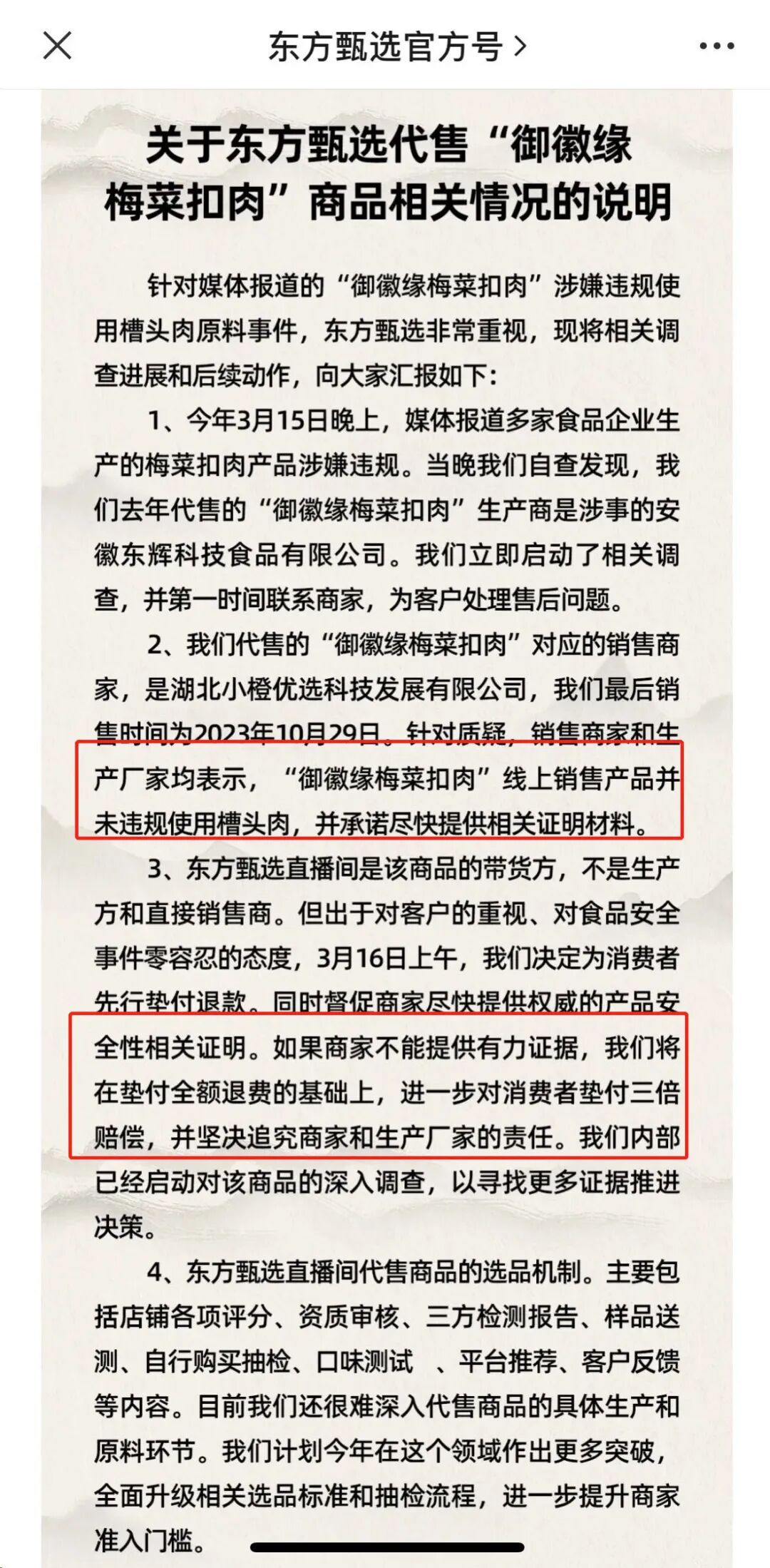 同时,如果商家不能提供有力证据,东方甄选将在垫付全额退费的基础上,对消费者垫付三倍赔偿。