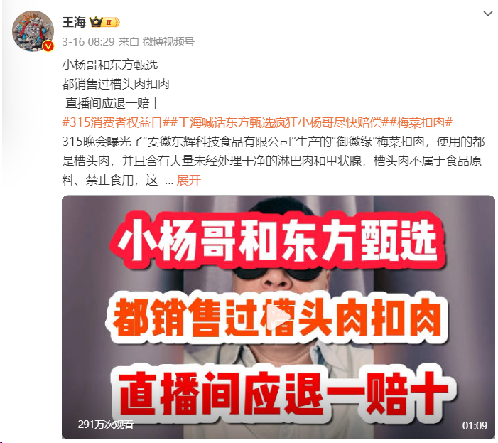 随着王海把矛头指向东方甄选、疯狂小杨哥,不少网友也开始质疑这些头部主播的信誉,认为他们和商家合伙欺骗消费者。
