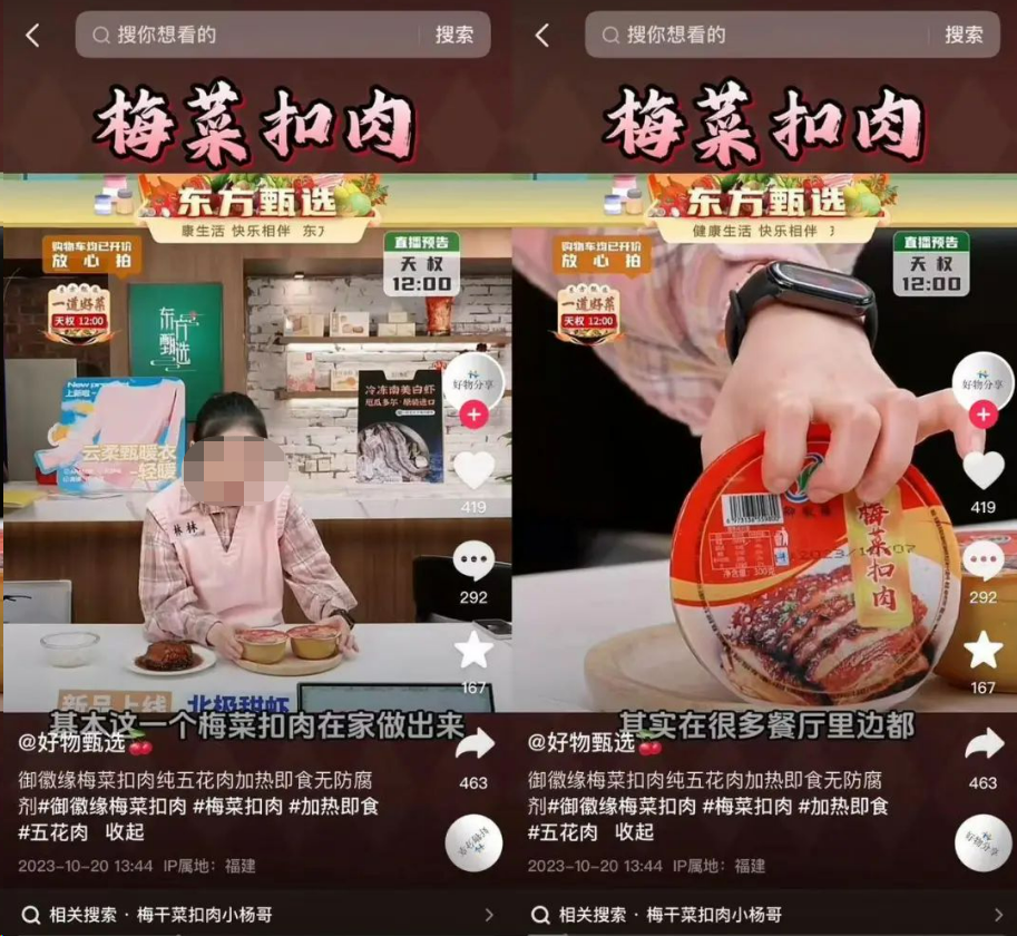 天眼查显示,被315晚会曝光的安徽东辉食品科技有限公司,其拥有的产品商标包括“御徽缘”。而打假人王海指出,小杨哥和东方甄选都曾带货过“御徽缘”梅菜扣肉,这款产品原料同样是槽头肉。