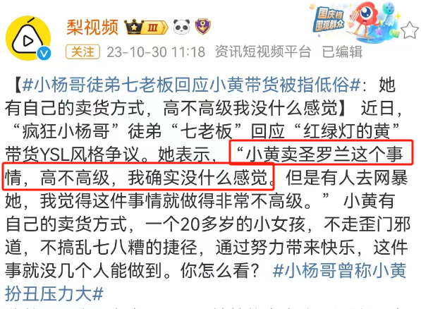 当时小杨哥另一个徒弟还回应对红绿灯的黄带货是否高级无感。