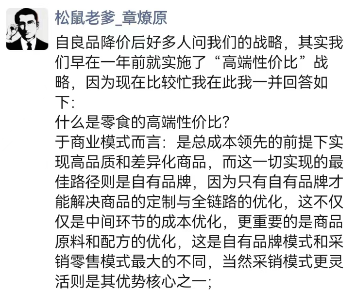 面对良品铺子的降价,三只松鼠董事长章燎原也罕见在朋友圈发声:“其实我们早在一年前就实施了‘高端性价比’战略。”