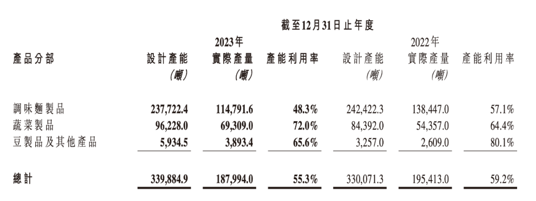 销量下滑的影响之二,是产能利用率的流失。2023年,卫龙调味面制品的产能利用率降低至48.3%,下降了约9个百分点;豆制品及其他的产能利用率也降低至65.6%,下降了约15个百分点。