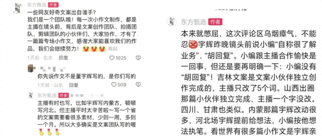 然而,东方甄选小编却在评论区称经典小作文多数由文案团队创作,并非全部出自董宇辉之手,并置顶了解答评论。