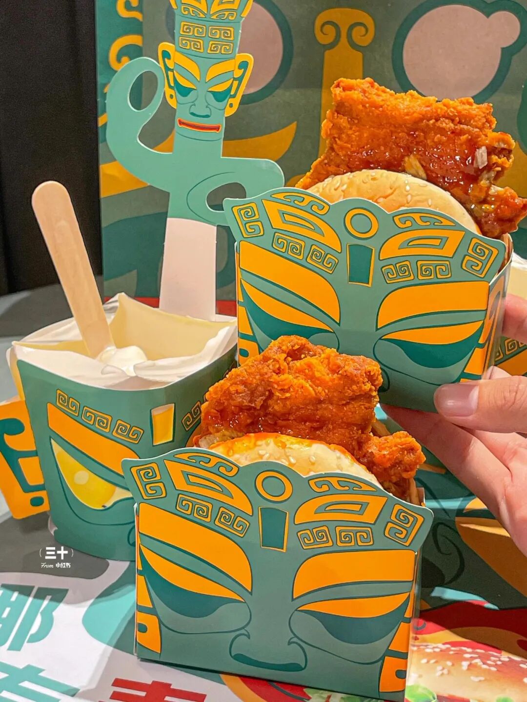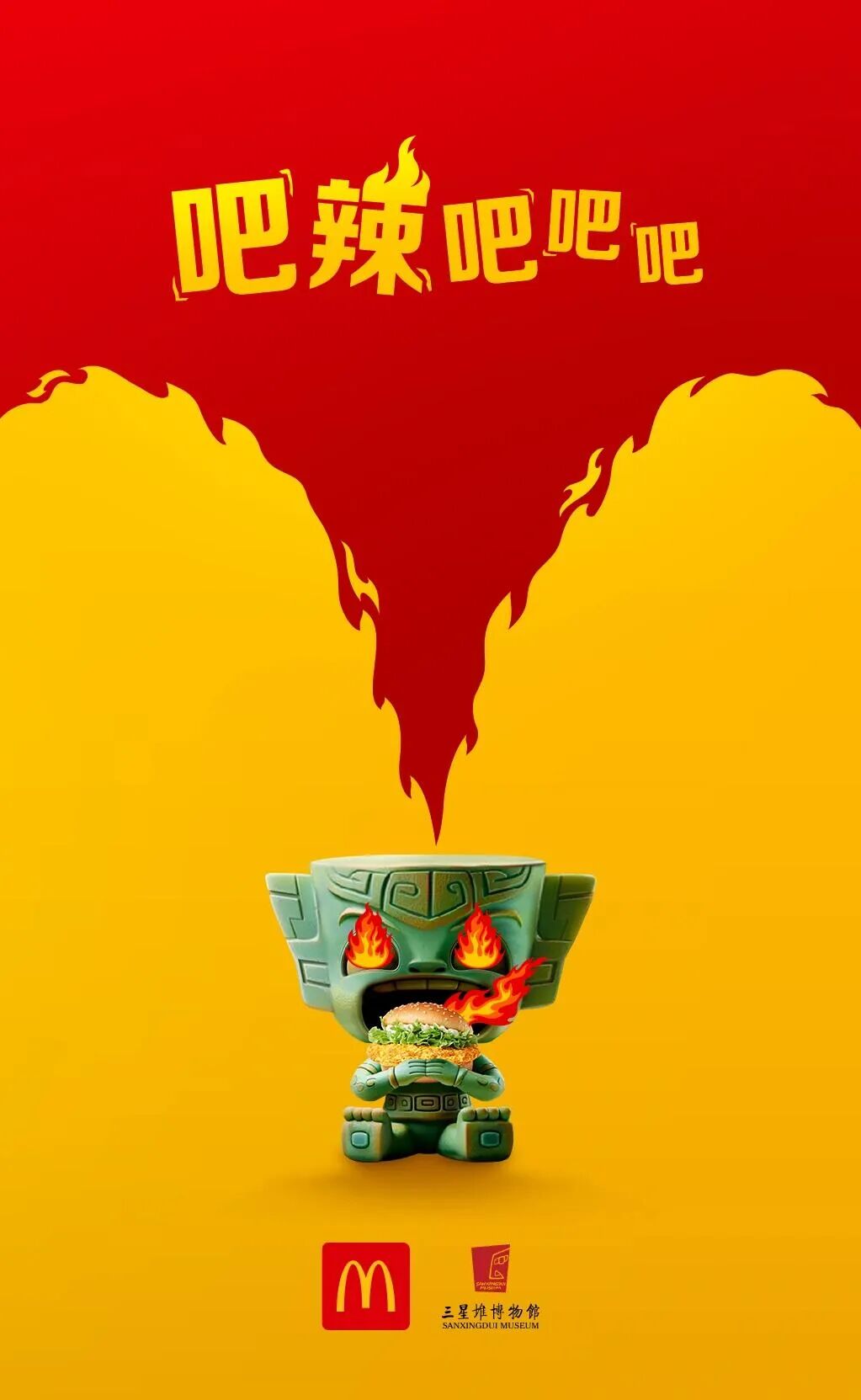而在玩梗的路上,麦当劳从不甘示弱。网友们还在调侃「原来古人也爱吃麦当劳」时,一不留神,麦当劳就让「青铜器时代的麦当当」照进现实,携手三星堆博物馆来了场跨越千年的「双向奔赴」,让现代美食和古文明瑰宝创意相碰撞,迸发出「热辣」滋味。