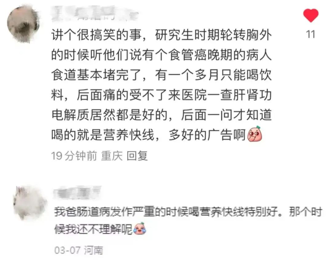 “我爸肠道病发作严重的时候,喝的就是营养快线。”甚至在一些民间故事中,营养快线已经化身为医生指定用药,坐实了自己“神药”的title。