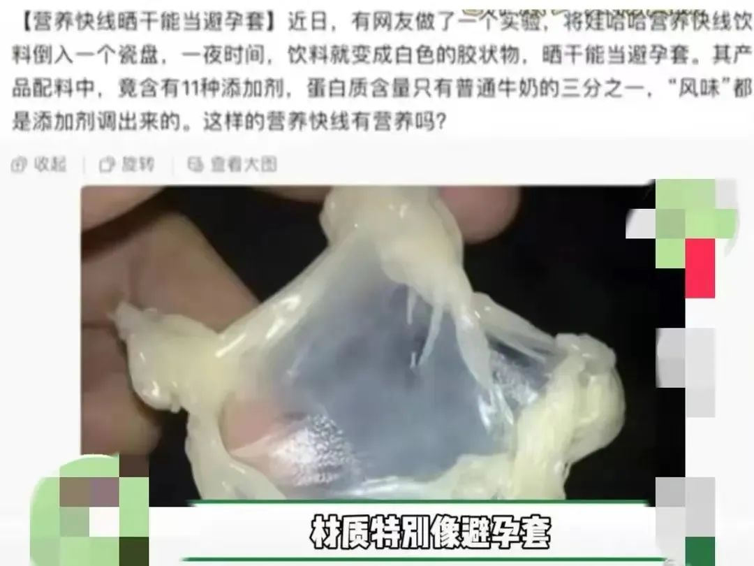 2011年,正当营养快线卖得火爆时,一个帖子在互联网上疯狂流传:营养快线放置一夜会变成白色的胶状物,晒干能当避孕套。
