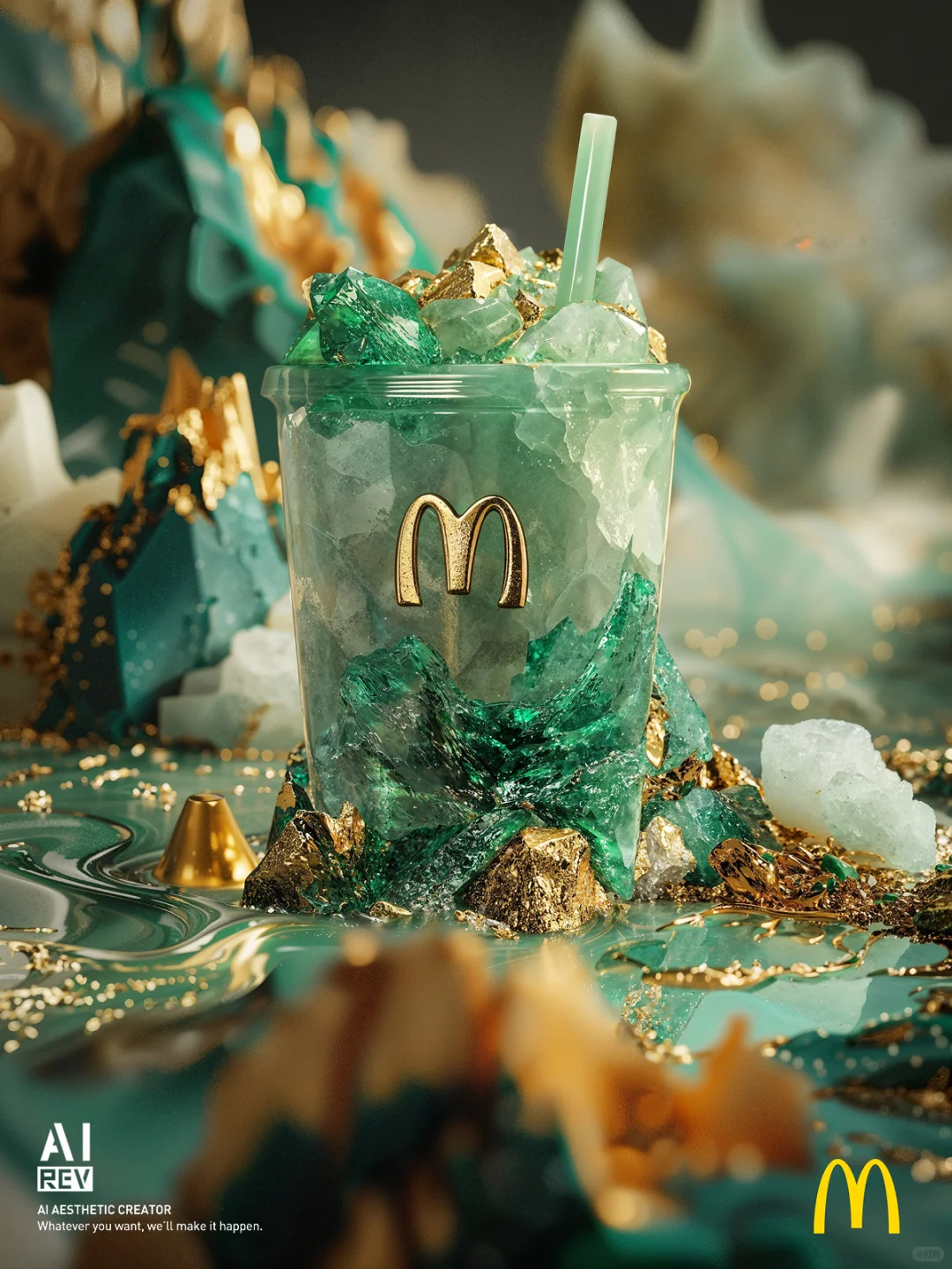 同系列的AI作品还有传世宝玉薯条,亮晶晶薯饼,黄金麦辣鸡翅,青花瓷可乐,白玛瑙黄金麦乐鸡...真就一个看饿了