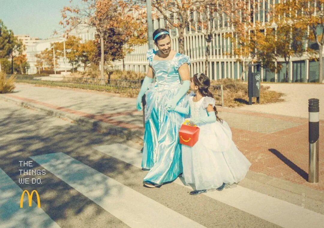 菲律宾麦当劳海报,让父亲扮演美人鱼、白雪公主、蝙蝠侠等小朋友喜欢的角色。