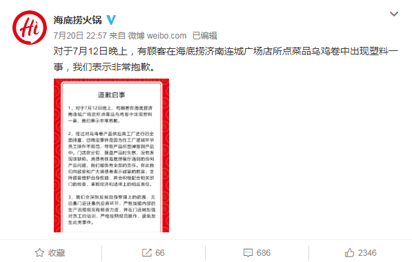 7月20日,海底捞因“塑料乌鸡卷”事件登上微博热搜,网友一片声讨。深夜,海底捞针对此事道歉,称经过排查该事件原因已确定为工厂灌装环节员工操作不规范,导致产品标签掉落到产品中。