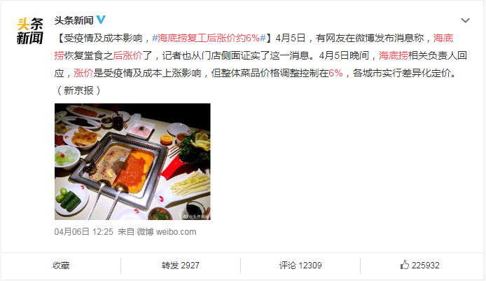除了食品安全问题,今年一季度,海底捞复工后报复性涨价,也引发消费者强烈不满。