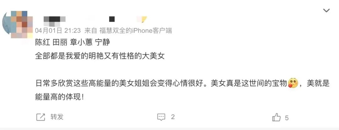 正如网友所说的,“陈红、田丽、章小蕙、宁静,全部都是我爱的明艳又有性格的大美女”;“章小蕙小姐,真的有好强大的内核”。