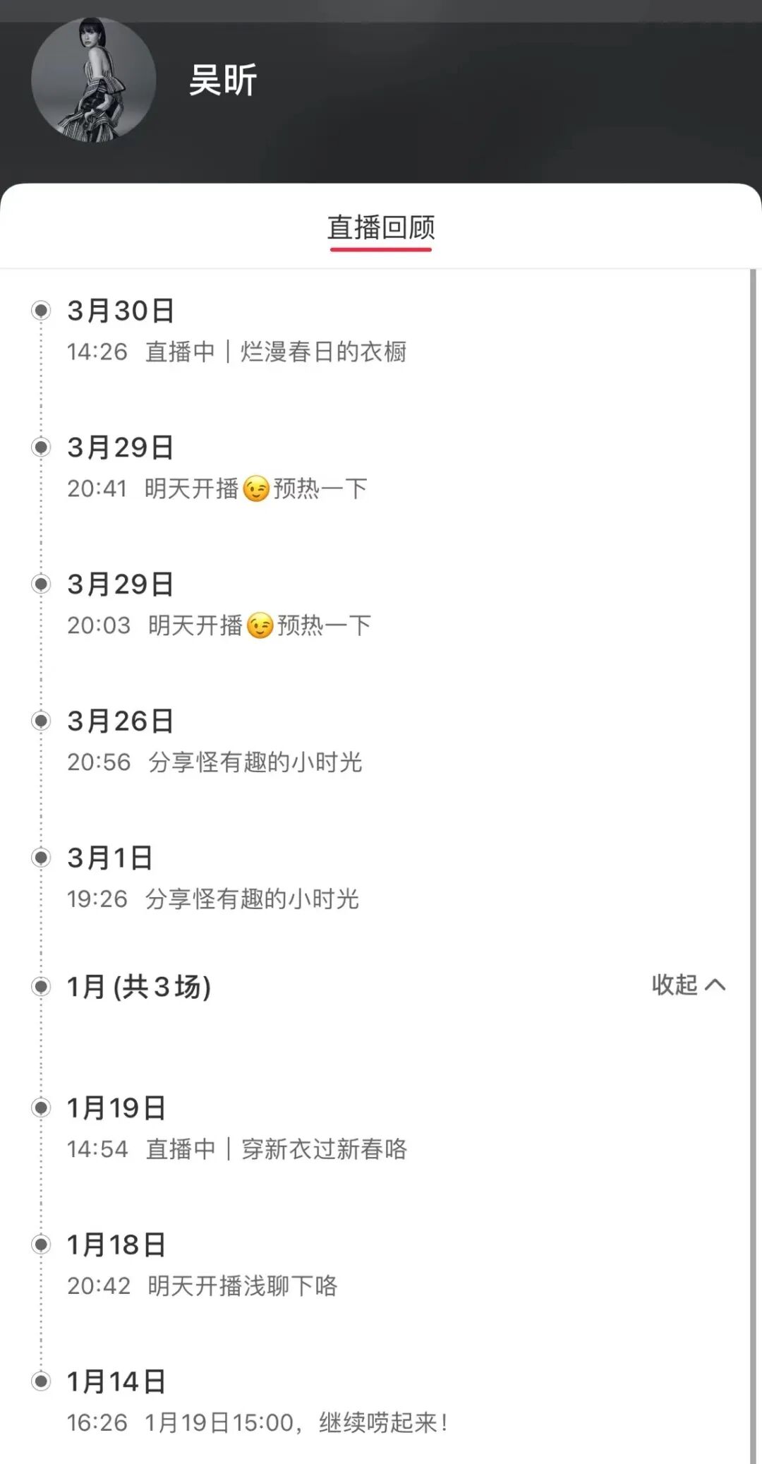 从吴昕目前的直播主题内容来看,其主要聚焦服饰穿搭。如3月30日的直播话题是“烂漫春日的衣橱”,1月19日的直播话题为“穿新衣过新春”。