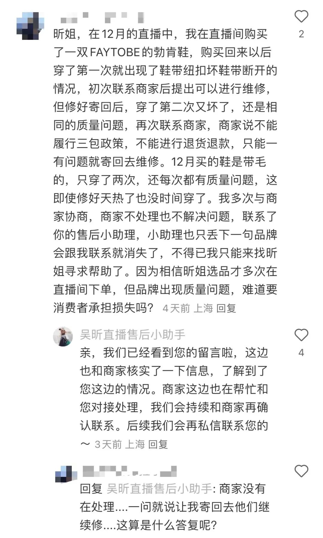 有不少消费者提到,自己是在找了商家和吴昕售后小助理之后,依然没能解决问题,才来到评论区反馈问题。
