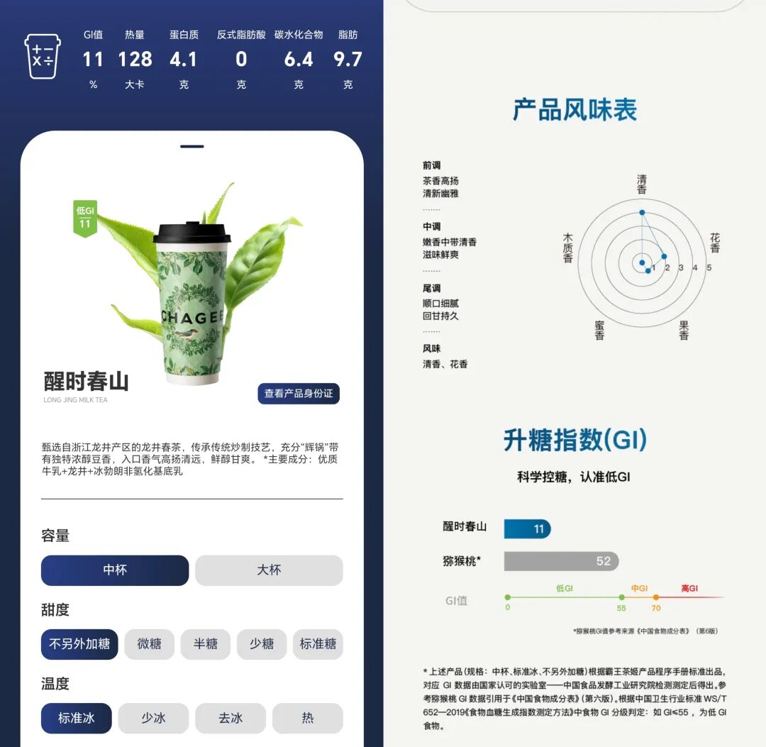 霸王茶姬“自我爆料”公布产品的热量成分,并在门店菜单、小程度等平台上线“低负担控糖专区”,增设相关“低GI”标识,为消费者提供更直观的选择依据,降低购买决策成本。