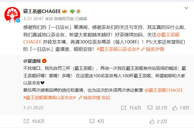 随后,翟潇闻赠送一万杯霸王茶姬以示歉意,霸王茶姬大方加码三万杯“以茶会友”,打开了品牌格局。