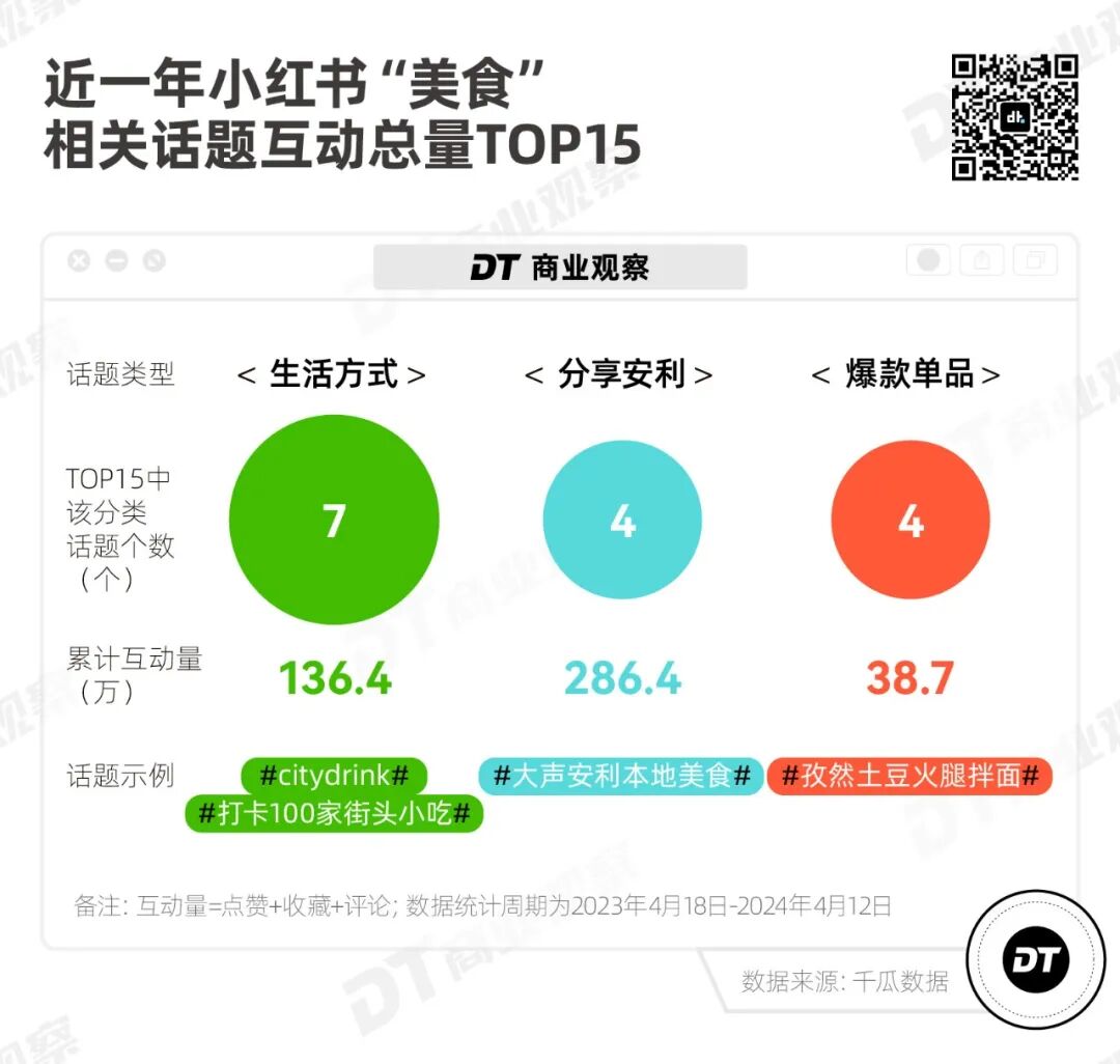 《DT商业观察》查看了过去一年小红书上的热门美食话题,发现引起广泛互动的主要有三类: