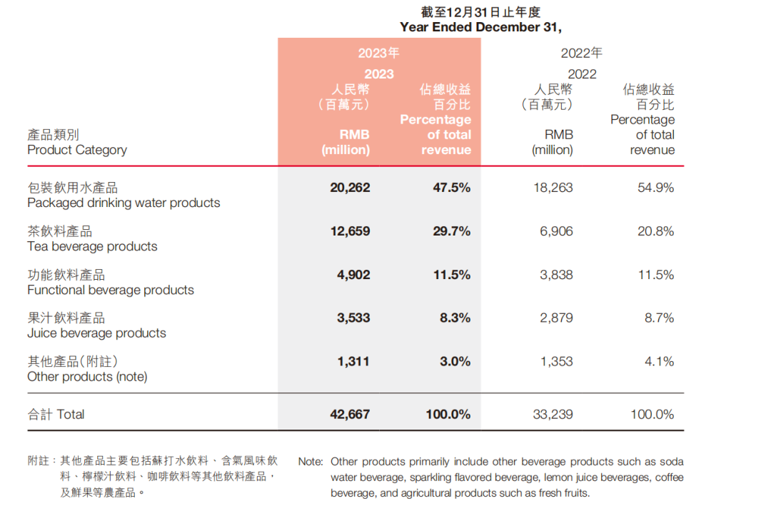 一个最显著的对照组依然是农夫山泉,根据其2023年业绩报告,农夫山泉在茶饮料品类中已经突破了百亿营收大关。尼尔森数据显示,2023年,农夫山泉推出的无糖茶饮料——东方树叶的销售收入同比增长超100%。茶π、农夫果园、NFC果汁等品牌也在持续发力。