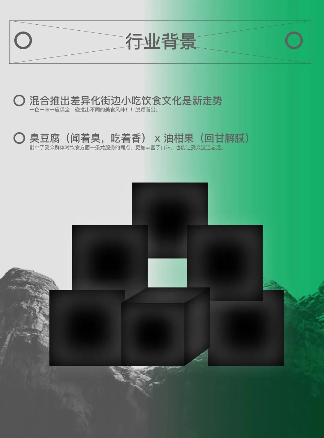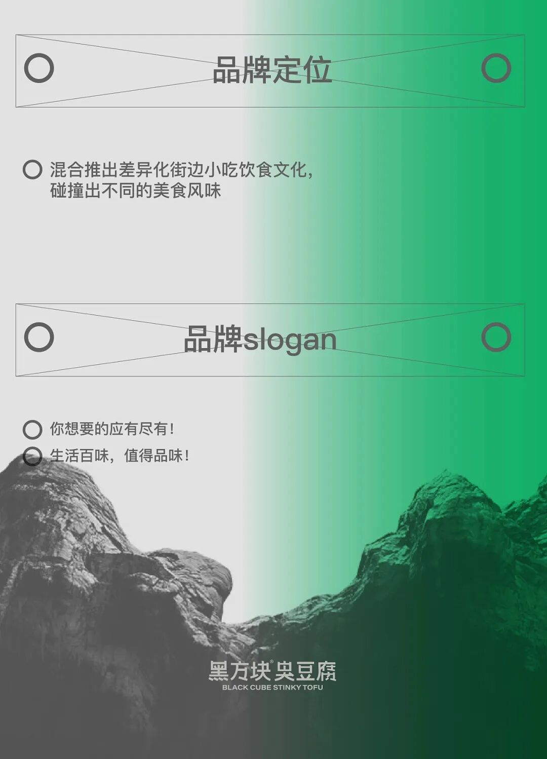 黑方块臭豆腐是一家由品牌主理人以及其家人从“街边走鬼档”做起来的一个臭豆腐品牌,自创立起一直秉承着勤恳做事致力把品牌产品的“臭味”发扬光大,吸引了很多的回头客,想做到更长远所以希望把品牌形象往外推出,做出系统化的品牌视觉,形成品牌力。
