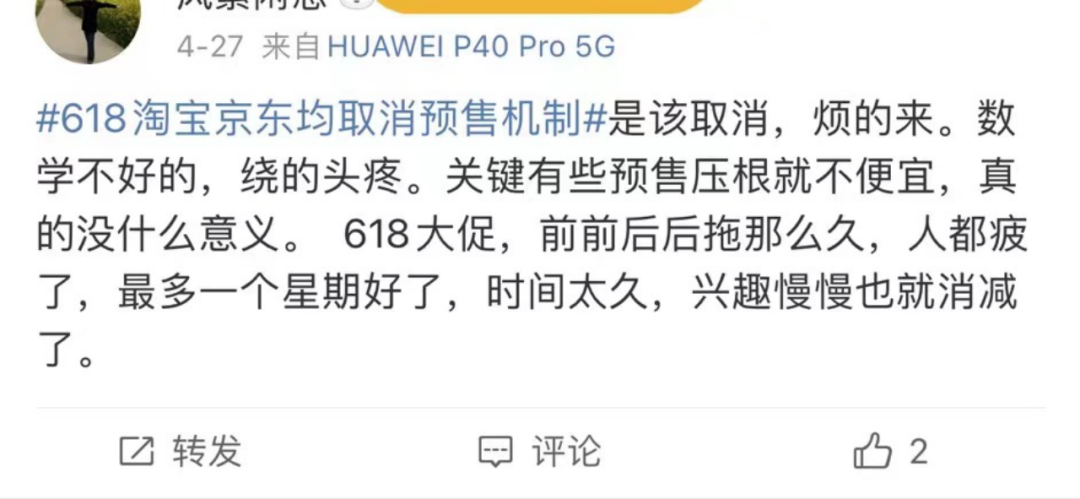 面对品牌商家们越来越多的“花招”,消费者们对预售的热情也逐年降低。有网友表示,数学不好的,绕的头疼。关键有些预售压根就不便宜。