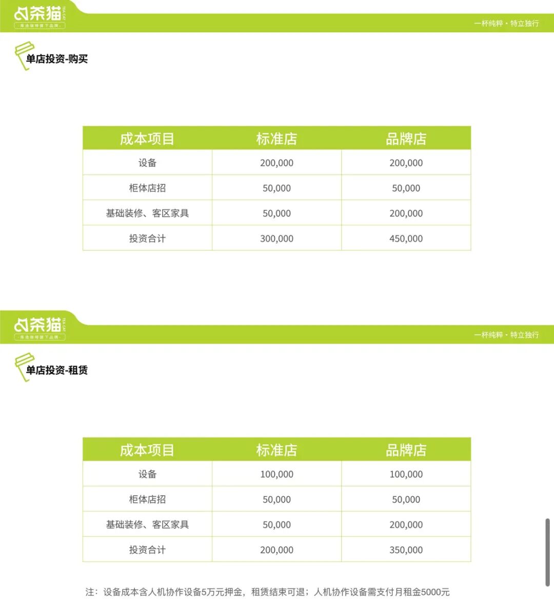 据报道,开一家茶猫的标准店,大概需要投资20万到30万元左右。店里的人机协作设备可以买也可以租,现在购买有折扣价大概是12万元,正常价格为15万元。如果采取租赁的形式,每台需交押金5万元,月租金5000元,租期1年起。