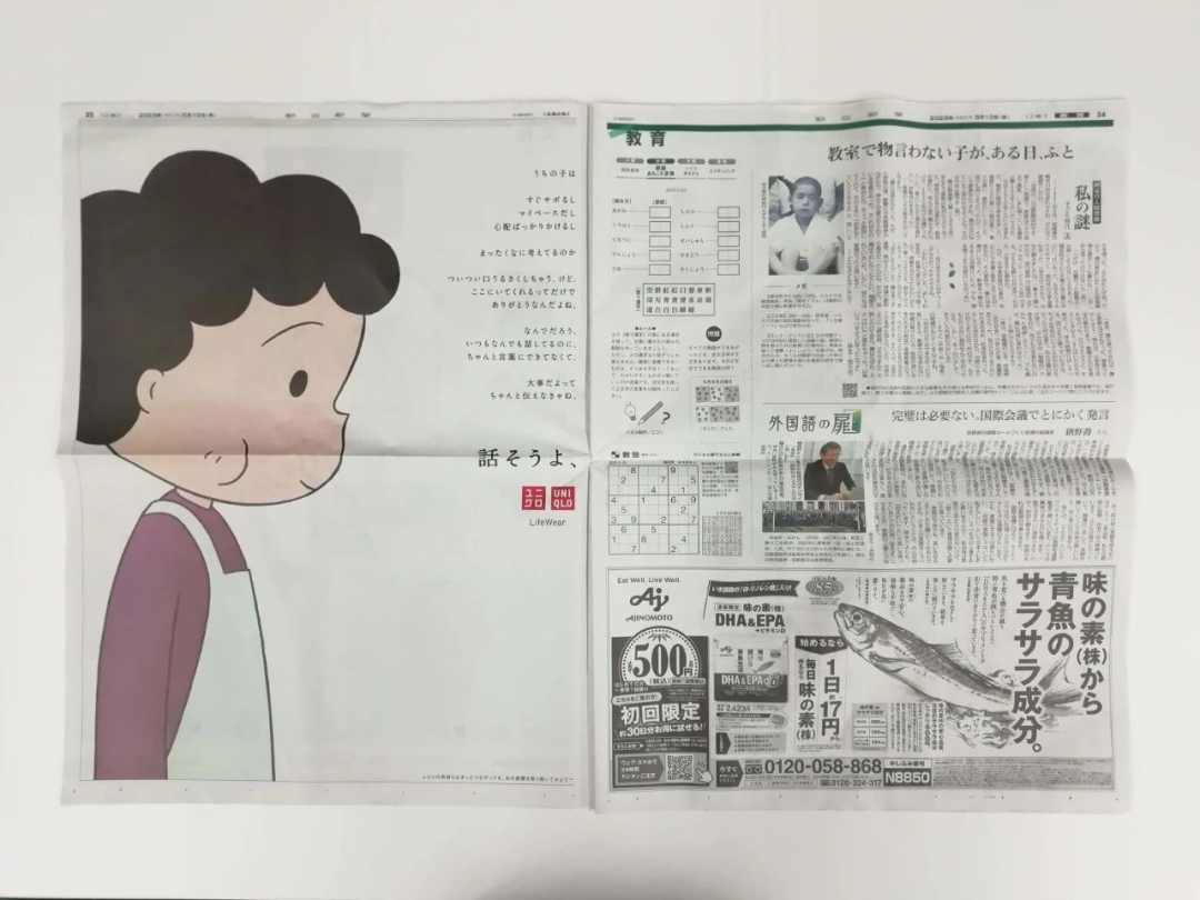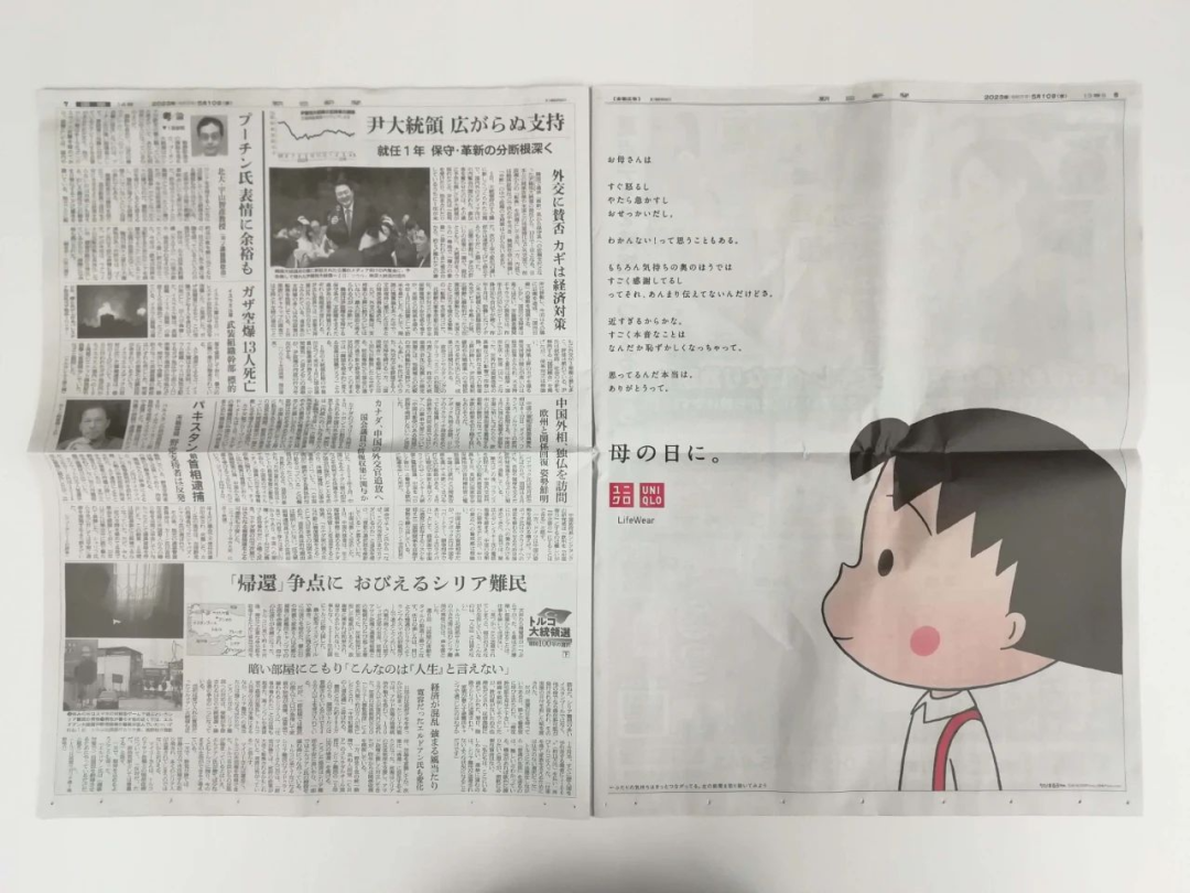 优衣库在朝日新闻报纸刊登了与动漫IP樱桃小丸子合作的母亲节创意广告,利用报纸排列顺序的特性,完成了一场母女之间的真情告白。