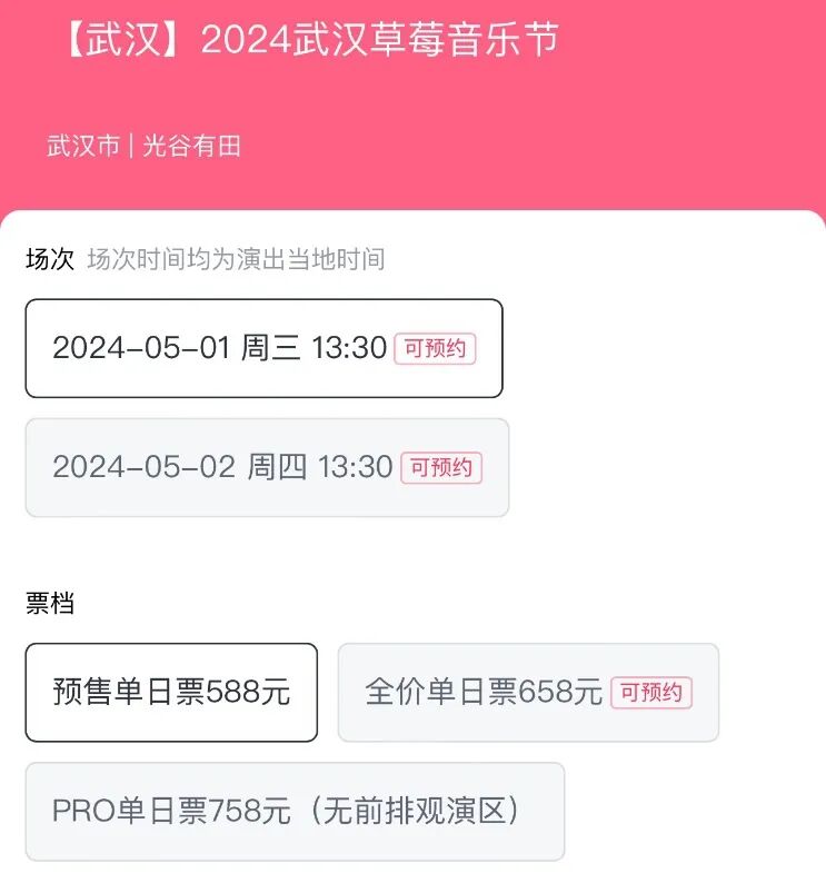 以武汉草莓音乐节为例,2011年草莓音乐节第一次空降武汉时,现场单日票为100元,学生预售单日票60元;2015年武汉草莓音乐节预售单日票为150元(现场180元),预售两日通票260元;而今年的预售单日票涨到588元,全价单日票658元,PRO单日票758元,同时还取消了两日通票。