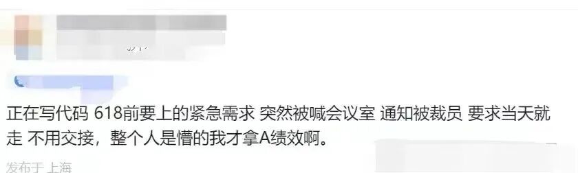 从其发布的截图来看,此次大规模裁员来得十分突然,而且行动迅速,中午通知裁员,晚上员工账号和权限就被关闭,甚至那些正在写618需求的技术员工也被裁掉了。