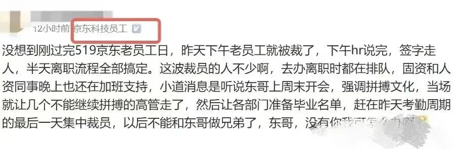 还有员工爆料称:没想到刚过完519京东老员工日,昨天下午老员工就被裁了,下午hr说完就让签字走人,半天时间离职全部搞定。而且这波裁员的人数不少,去办理离职时都在排队,固资和人事晚上也还在加班提供支持。