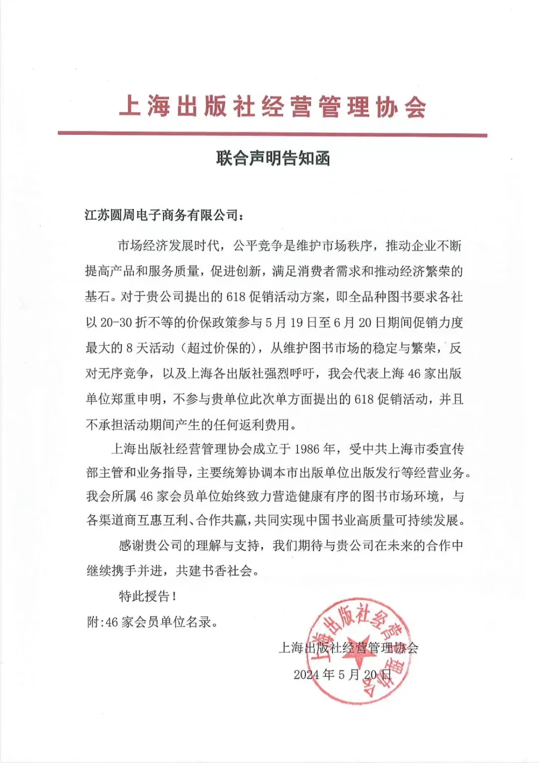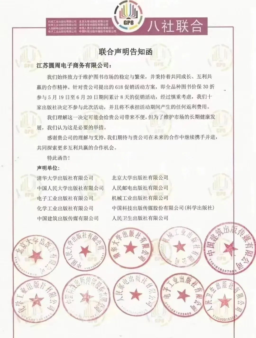 据网络流传的两份联合声明告知函显示,包括上海46家出版社在内的多家出版机构,以及北京大学出版社、中国人民大学出版社、清华大学出版社等北京10家重量级出版社,明确拒绝参与京东618的促销活动。