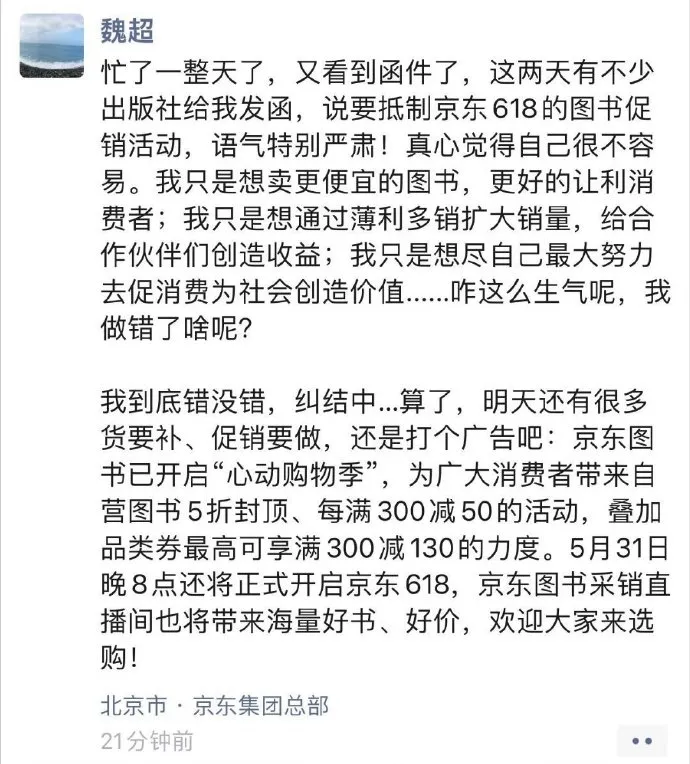 针对此事,5月21日晚,京东图书采销员工魏超,在朋友圈对多家出版社联合抵制京东618进行了公开回应。他表示:“我只是想通过卖更便宜的图书,更好的让利消费者;我只是想通过薄利多销扩大销量,给合作伙伴们创造收益;我只是想尽自己最大努力去促消费为社会创造价值......咋这么生气呢,我做错了啥呢?”