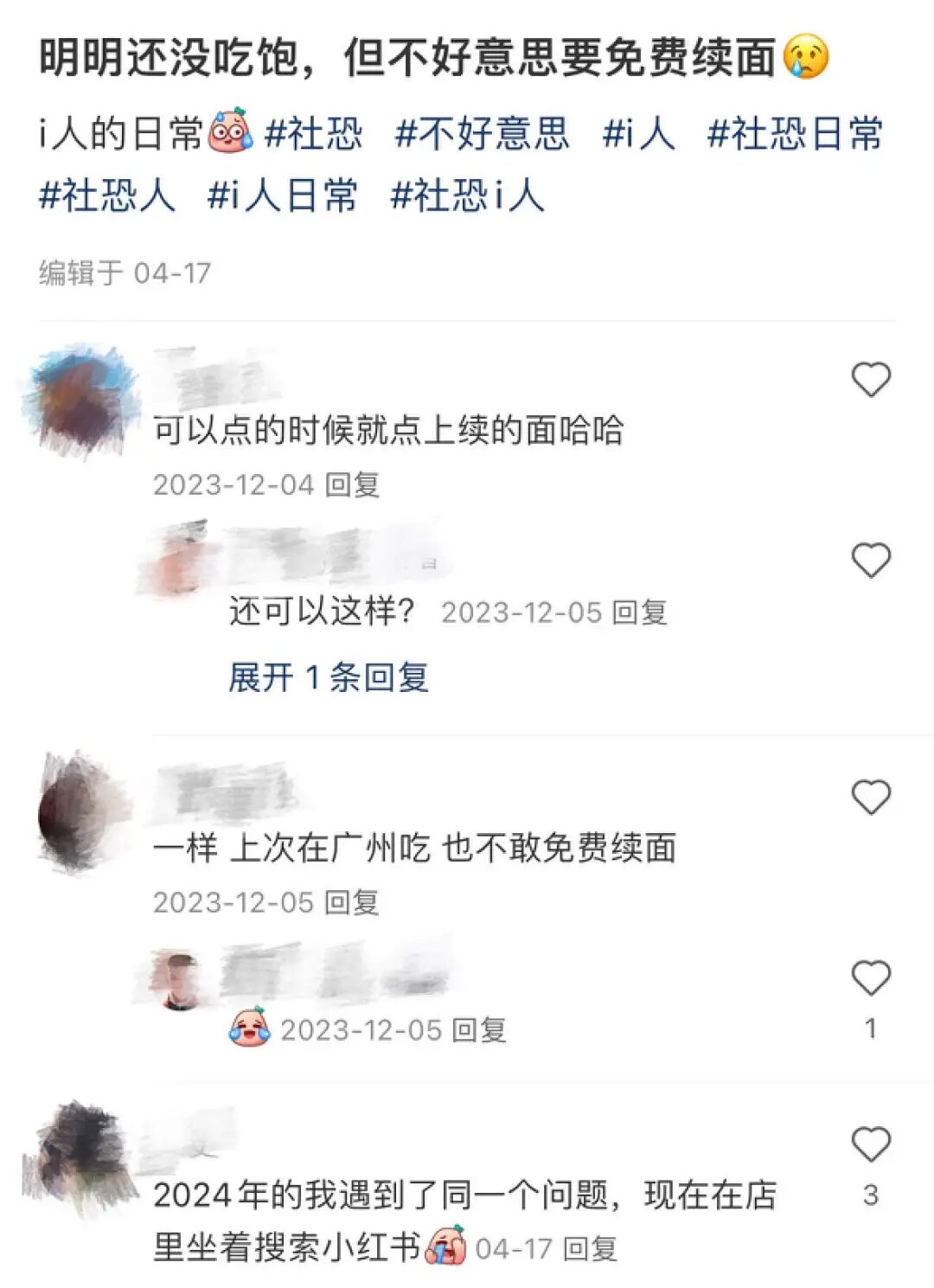 “ 明明没有吃饱,但不好意思续面。”网友@麻辣汤圆 指出,每次续面仿佛来到I人(内向)的人地狱,害怕别人觉得你占便宜,更担心服务员吐槽“女孩家怎么这么能吃”。
