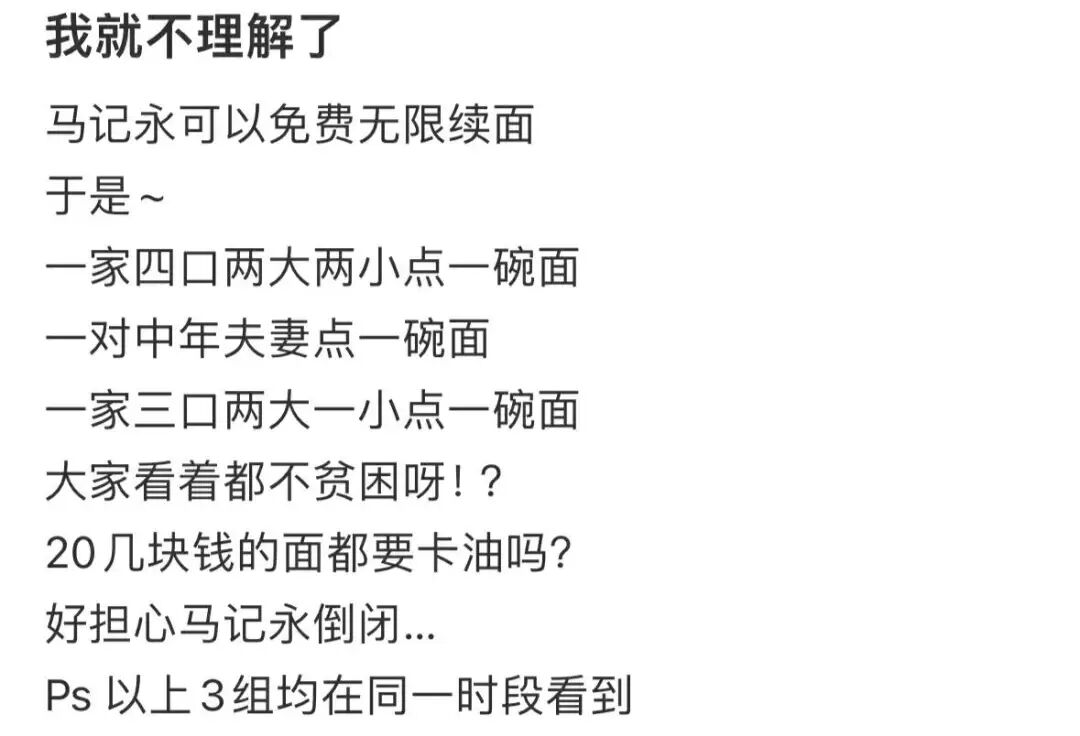 所以倒也不能否认续面颇具穷鬼套餐的显性,有人自己续,有人干脆搭伙来吃。两人吃一份再续一份让“把一块钱掰成2瓣花”走进现实。网友@江小梨???? 在去年指出,当李佳琦从李老头变成资本的代言人,嫌弃你工作不努力时,只有牛肉面不会骗你,牛肉是真的,面是真的,便宜大碗也是真的。