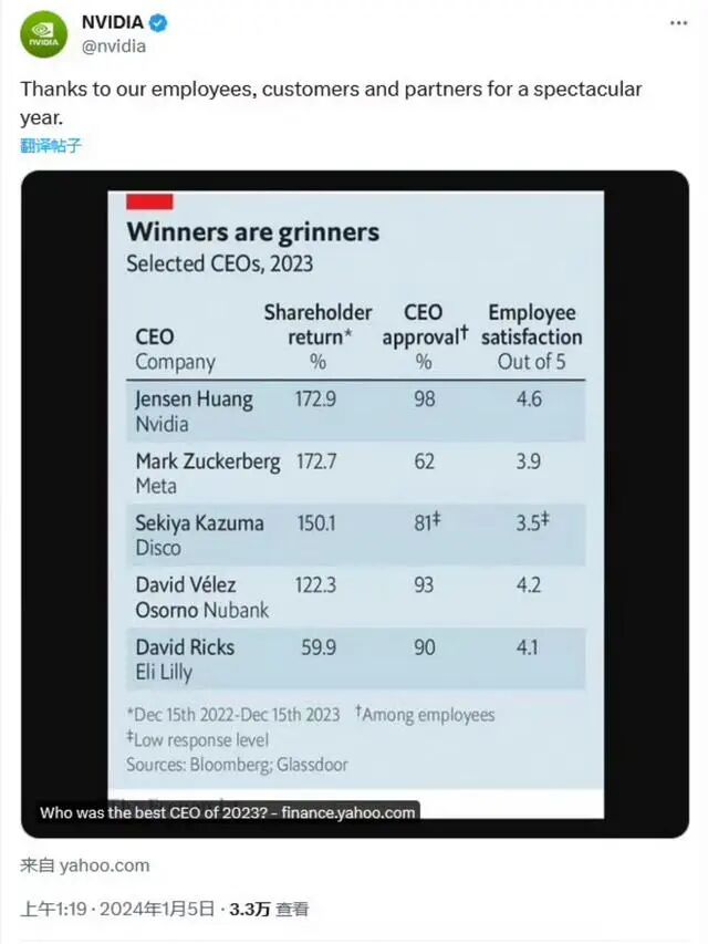 《经济学人》杂志在对全球大型上市公司的老板进行综合分析后,评选出了2023年排名前五的优秀CEO。