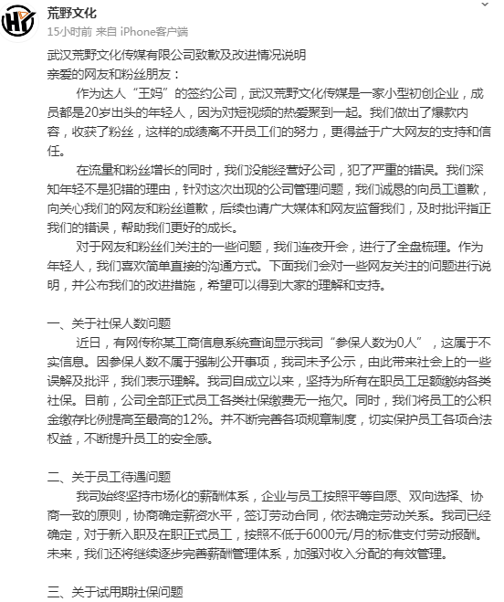 不只是在@七颗猩猩上通过“王妈”本人回应,28日晚上,荒野文化传媒公司也在微博“紧急”发布道歉与改进声明。
