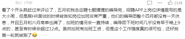 看王妈的更新频率就知道工作强度肯定不会低,其岗位的工作强度也是被经历过面试的网友所“吐槽”。