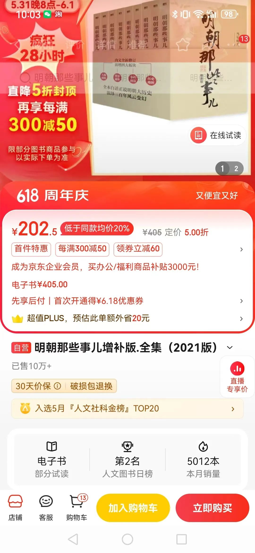 沈浩波开炮当晚,我们去对比了一下各平台的图书价格。以磨铁旗下畅销书《明朝的那些事儿》为例,当当网的价格为243元-262元左右,京东标价202.5元,号称“低于同款均价20%”。这还没算上京东618活动的满减优惠。