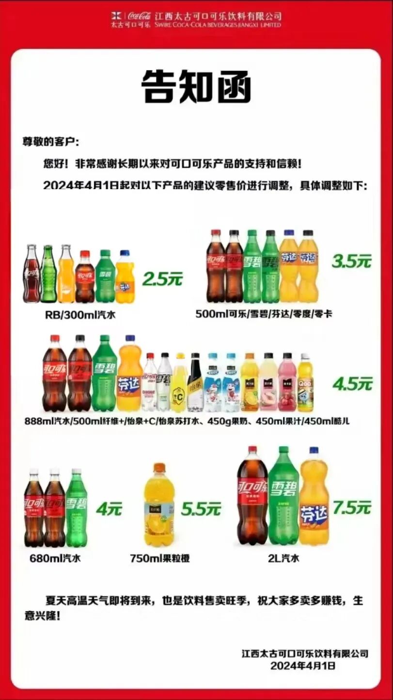 据《首席品牌观察》了解,早在4月份,湖北太古可口可乐、江西太古可口可乐、郑州太古可口可乐已经陆续发布部分产品调整的告知函称,4月下旬起部分产品供货价格调整,建议零售价从3元/瓶调整至3.5元/瓶,提价幅度16%。