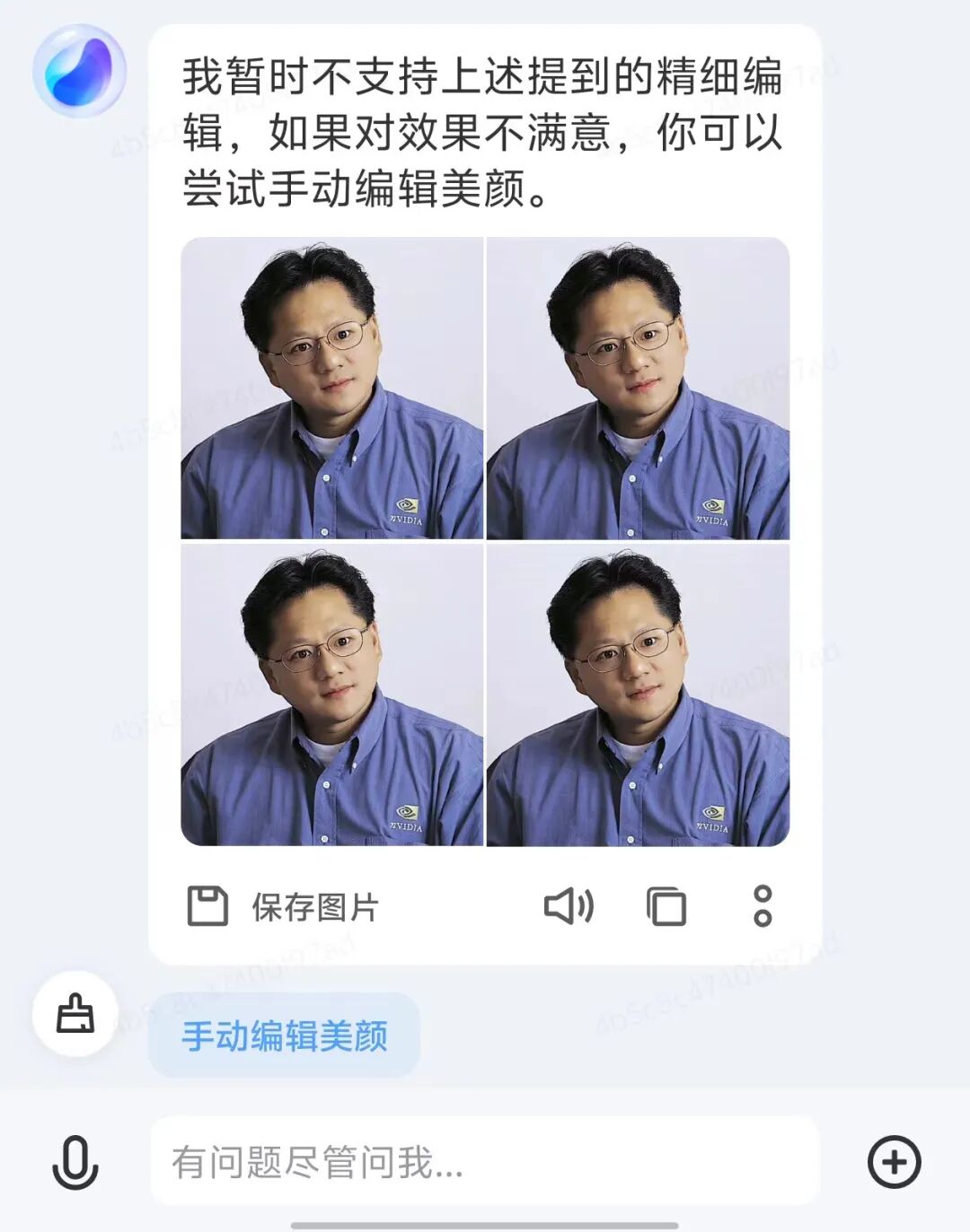 从两次测试来看,蓝心AI修图的确有大模型算法介入,比如苏妈和老黄的美颜逻辑和思路有明显的区别,前者或许原图本身就有一定程度的化妆,所以vivo的算法尽可能轻量化修图,而老黄并未带妆接受采访,所以其美颜的程度也更大一些。不过,vivo将老黄的眼睛部分修得也有点太过分了,不仅放大了眼睛,还加了眼线、双眼皮,外眼角也做了扩大处理。