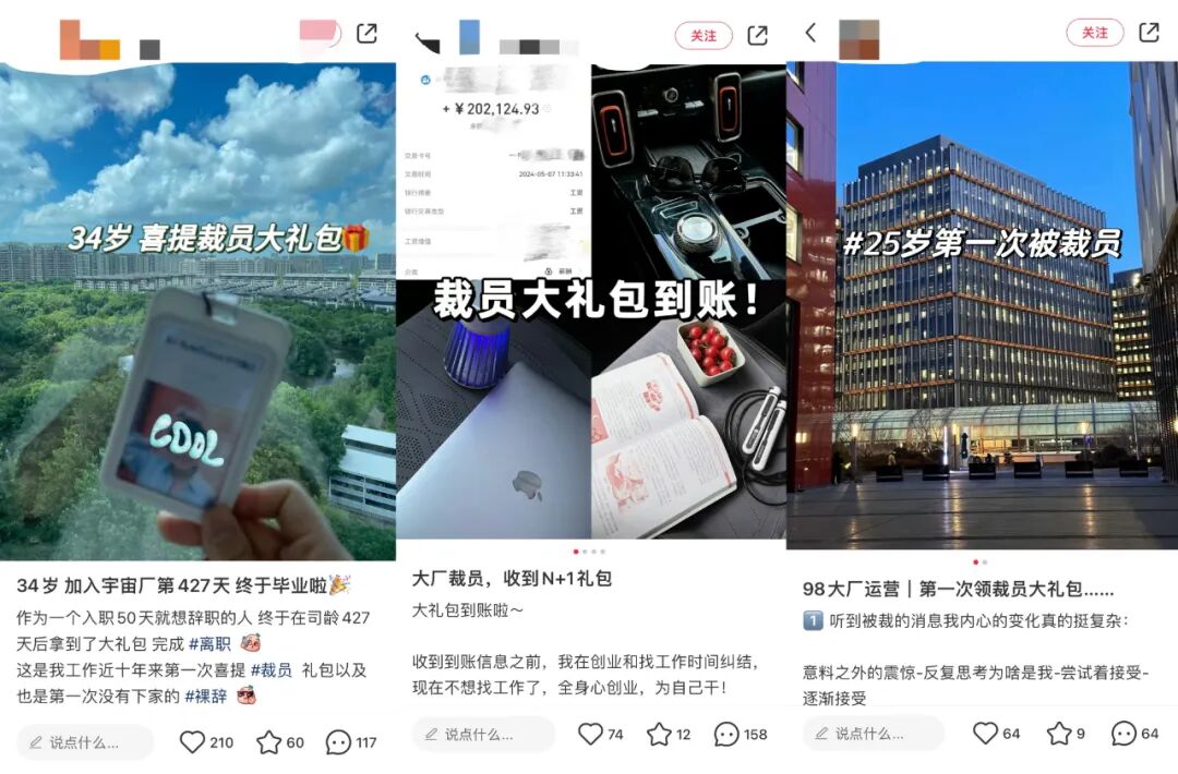 从现实因素来讲,前文提到的裁员潮也让很多人被动成为“离职博主”。社交媒体上,有不少分享自己“喜提大礼包”、“在大厂毕业”的经历,甚至还有人分享被裁赔偿经验。