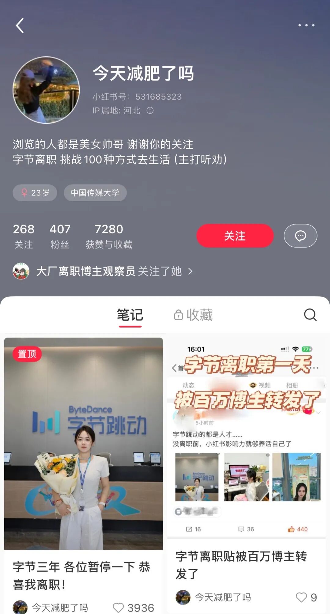 @今天减肥了吗发布的“字节三年,各位暂停一下,恭喜我离职”的帖子,获得了不错的热度,但涨粉效果不佳,目前小红书粉丝只有407。主页中虽然标注了“挑战100种方式生活”,但目前还没有相应的内容输出。