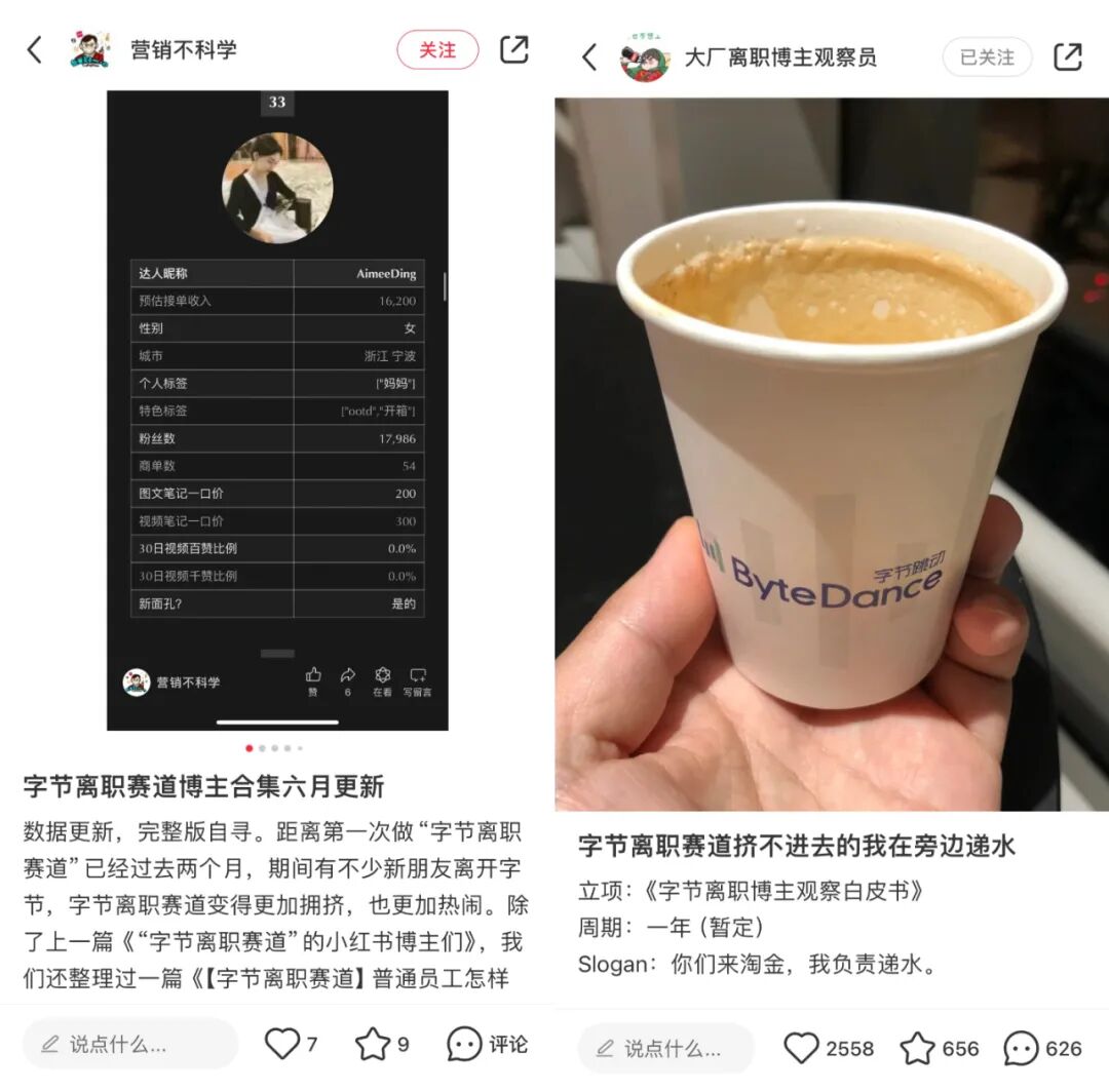 博主@营销不科学分别整理出了“字节离职赛道”、“腾讯离职赛道”、“阿里离职赛道”的小红书博主们,并列出了详细的接单收入、粉丝数、商单数、笔记报价。虽然真实性待确认,但六位数的收入还是让很多人在看乐子的同时,惊觉原来离职的流量红利,已经让部分人实现了财富积累。