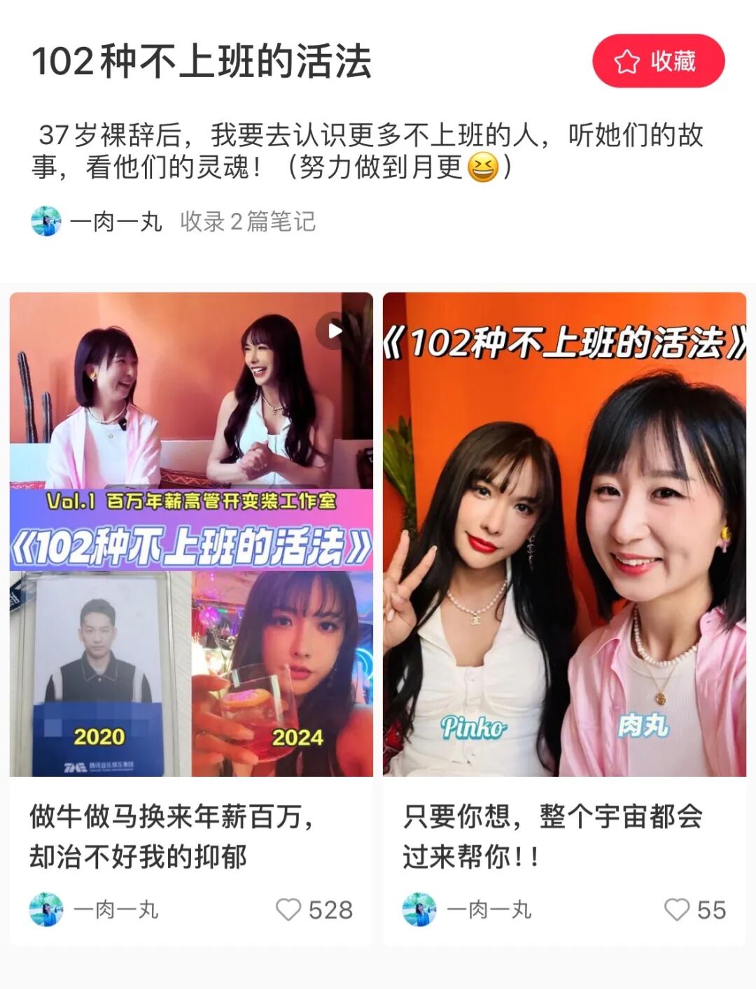 离职后@一肉一丸推出了职场向访谈《102种不上班的活法》,以更扎实的内容进行转型、吸引用户,首期嘉宾也是一位“互联网大厂离职博主”@pinko大小姐。而且@一肉一丸的粉丝也是通过此前的职场vlog、八段锦直播、离职等多个内容积攒起来。